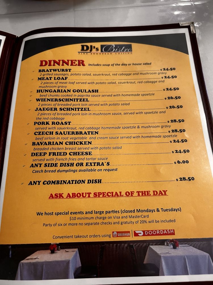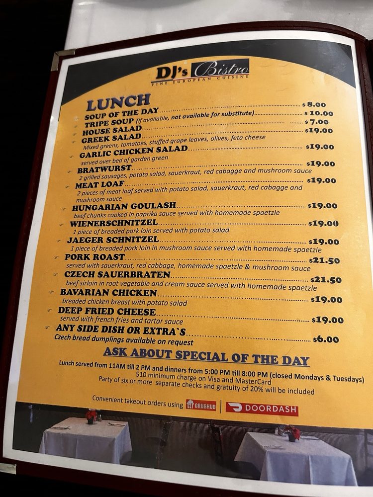 Introducing DJ’s Bistro, a casual eatery in Concord, CA, offering a diverse menu with limited vegetarian options. The restaurant provides waiter service, takes reservations, and accepts various payment methods. Diners can enjoy outdoor seating and Wi-Fi access while savoring authentic European cuisine. Popular dishes include Jaeger Schnitzel, Wiener Schnitzel, and Bavarian Chicken. Customers rave about the flavorful food and excellent service, with standout items like the chicken sandwich and strudel receiving high praise. The intimate ambiance and generous portions make DJ’s Bistro a hidden gem for European fare. Don't miss out on this culinary adventure in a cozy setting with a touch of authenticity.